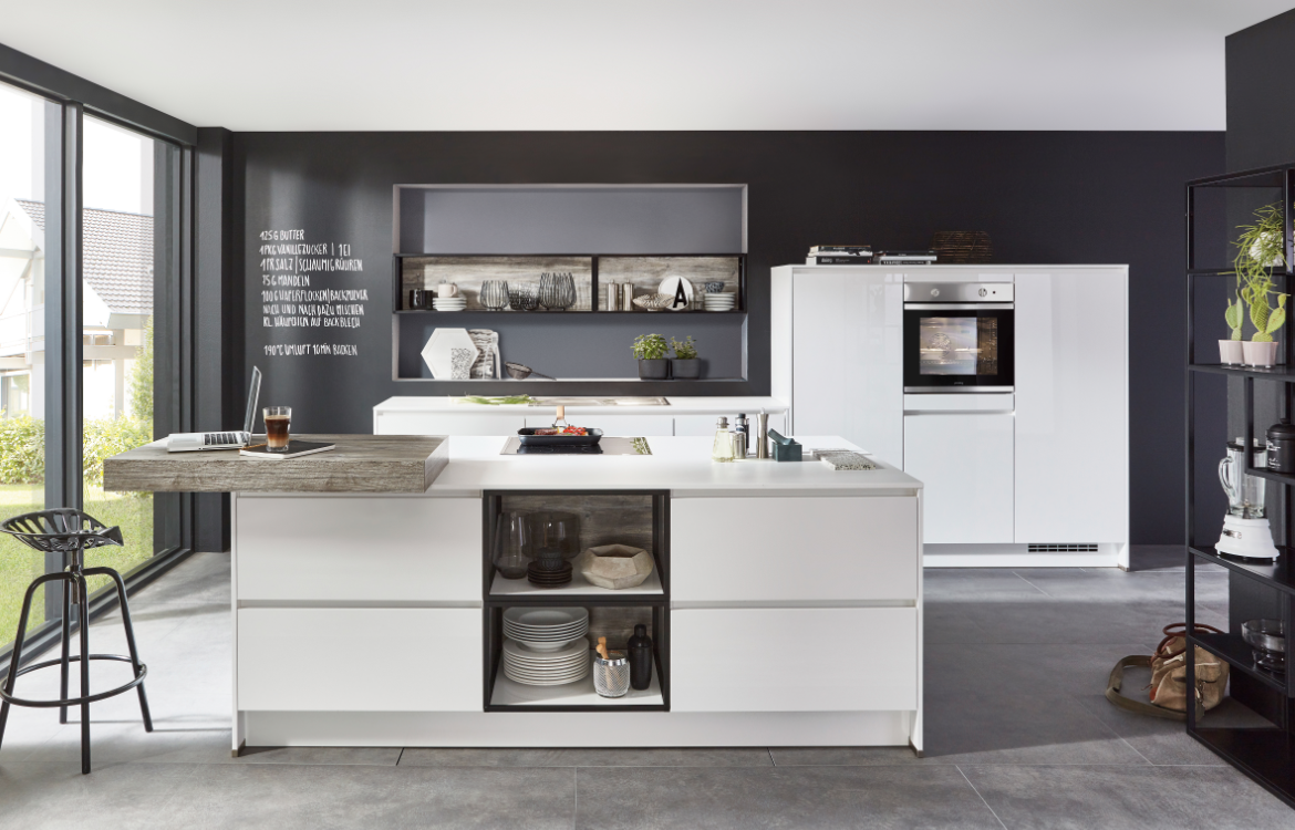 FLEXIBEL STELLBARE, 3-TEILIGE EINBAUKÜCHE MIT DEMI-ELEMENT UND EINLADENDER INSEL MIT ESSTHEKE
